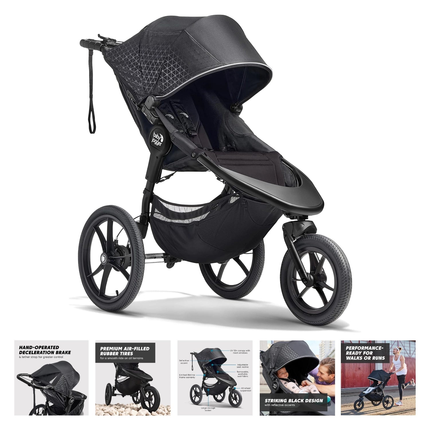 - All-terrain jogging stroller with locking swivel front wheel and car seat adapter