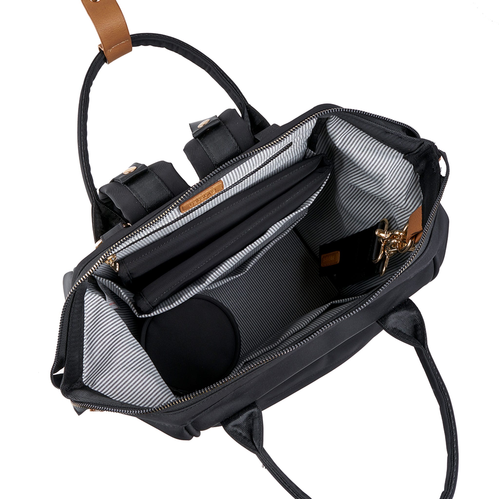 Spacious and stylish Mani diaper backpack with insulated pockets, wipeable lining, and stroller straps. Ideal for organized, on-the-go parenting.