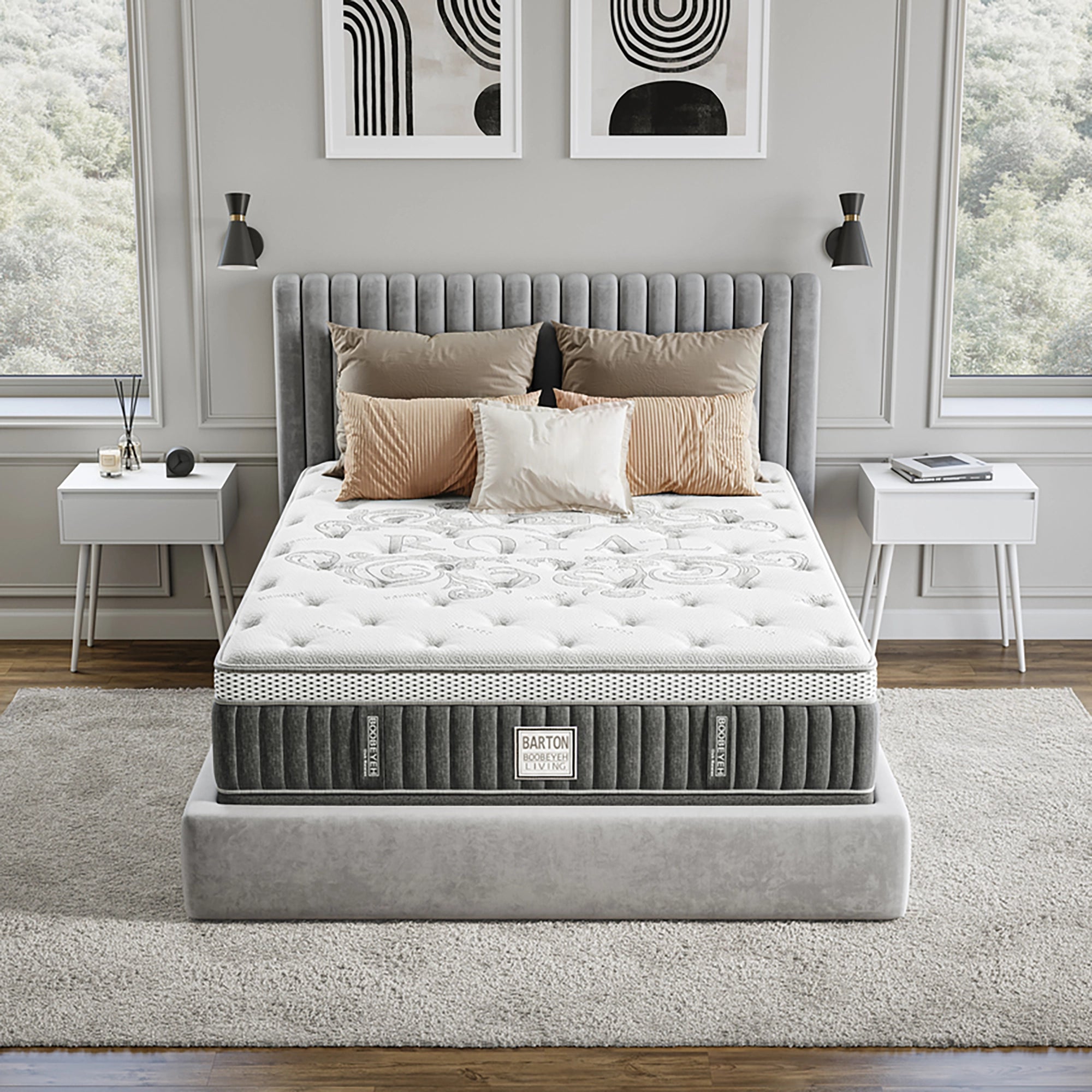 crafted with high-quality tempered bonnell coils, the barton queen 13-inch mattress conforms to your body's natural curves, reducing pressure points and promoting proper spinal alignment. its thick 13-inch profile ensures the ideal balance between firmness and softness for long-lasting comfort and uninterrupted sleep.